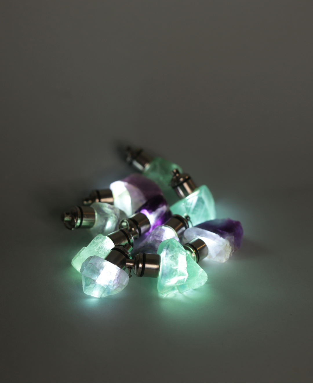 Every stone is naturally formed. The built-in LED light gently illuminates the quartz from within. Each necklace is a bit different since they have different formations and lines reflecting its growth inside of them.