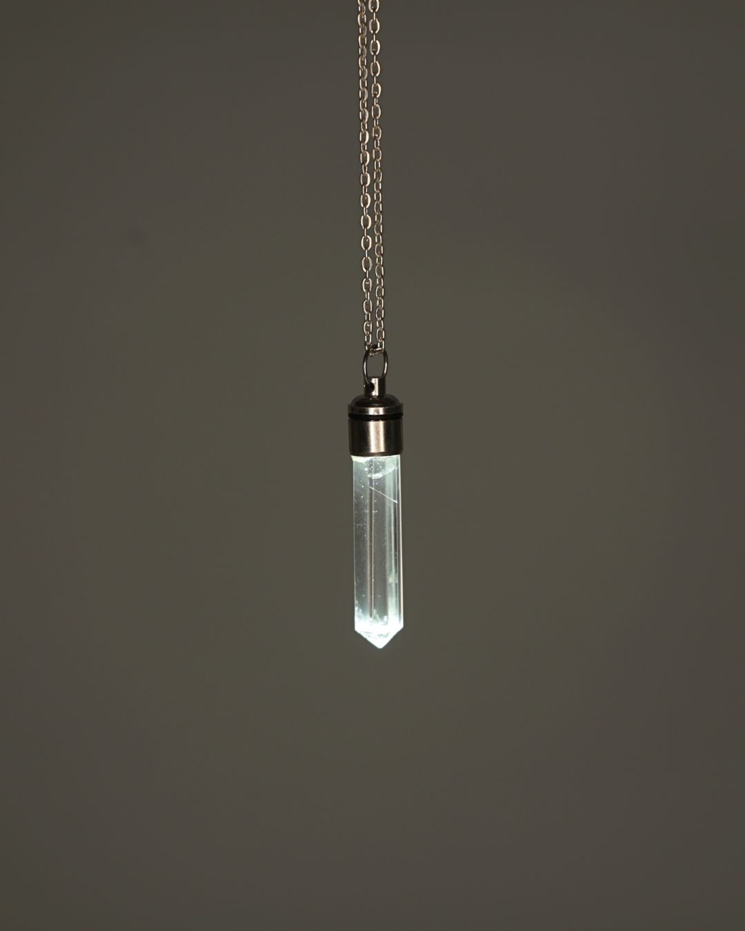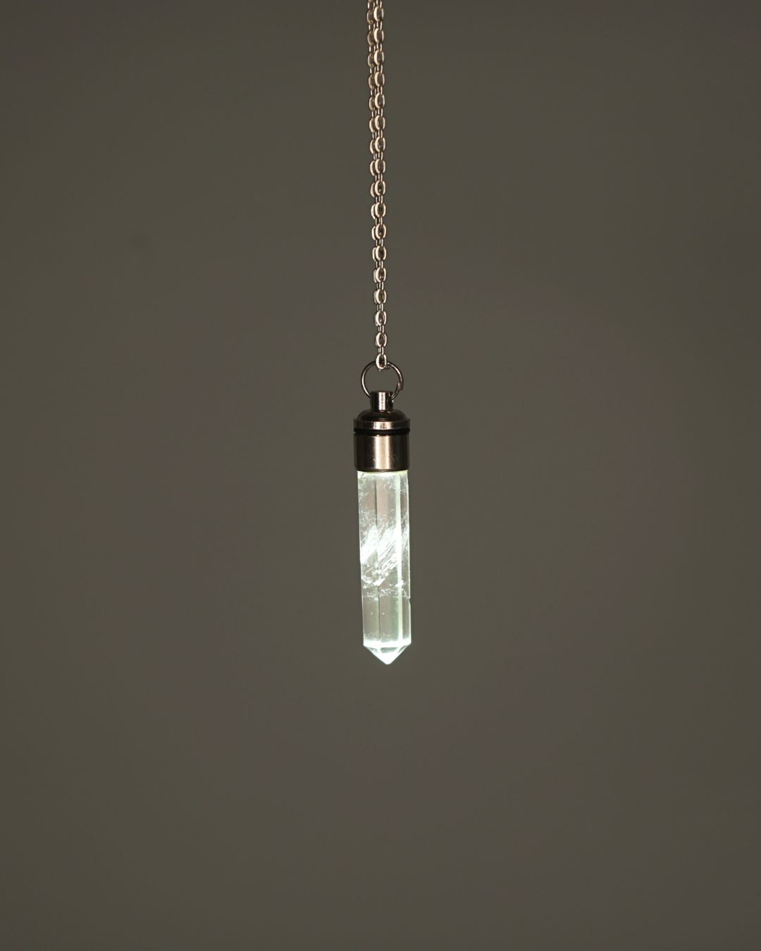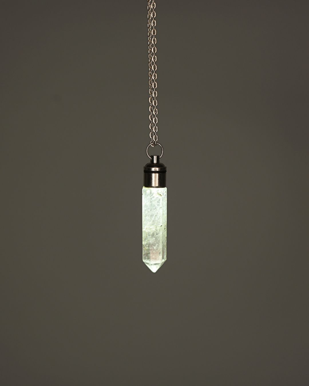 Every stone is naturally formed. The built-in LED light gently illuminates the quartz from within. Each necklace is a bit different since they have different formations and lines reflecting its growth inside of them.